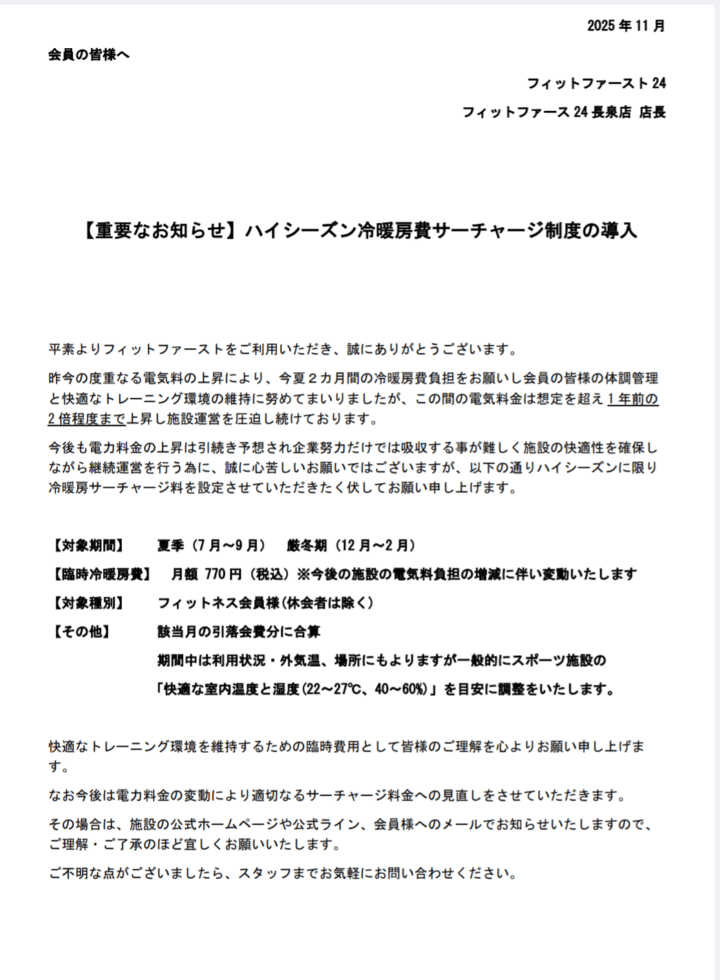 昨今の度重なる電気料の上昇により、今夏2カ月間の冷暖房費負担をお願いし会員の皆様の体調管理と快適なトレーニング環境の維持に努めてまいりましたが、この間の電気料金は想定を超え1年前の2倍程度まで上昇し施設運営を圧迫し続けております。