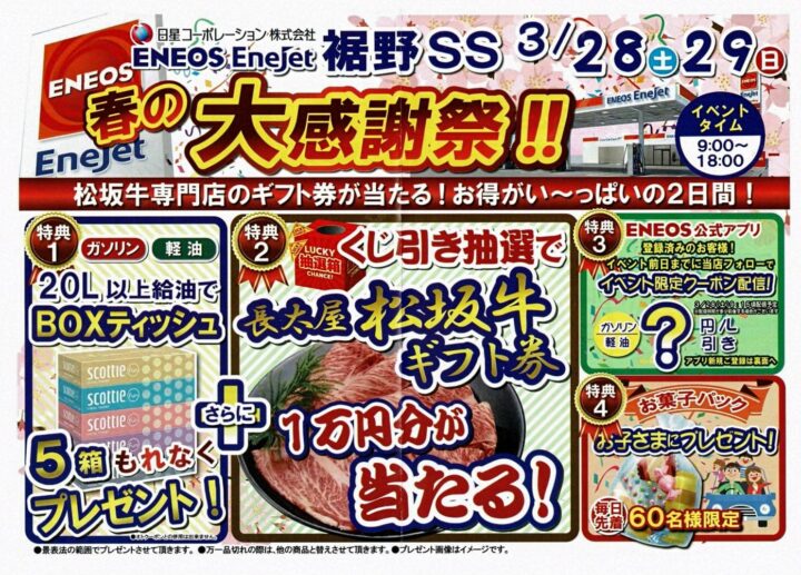 ENEOS Enejet裾野SSにて【春の大感謝祭‼】イベントが開催されます。